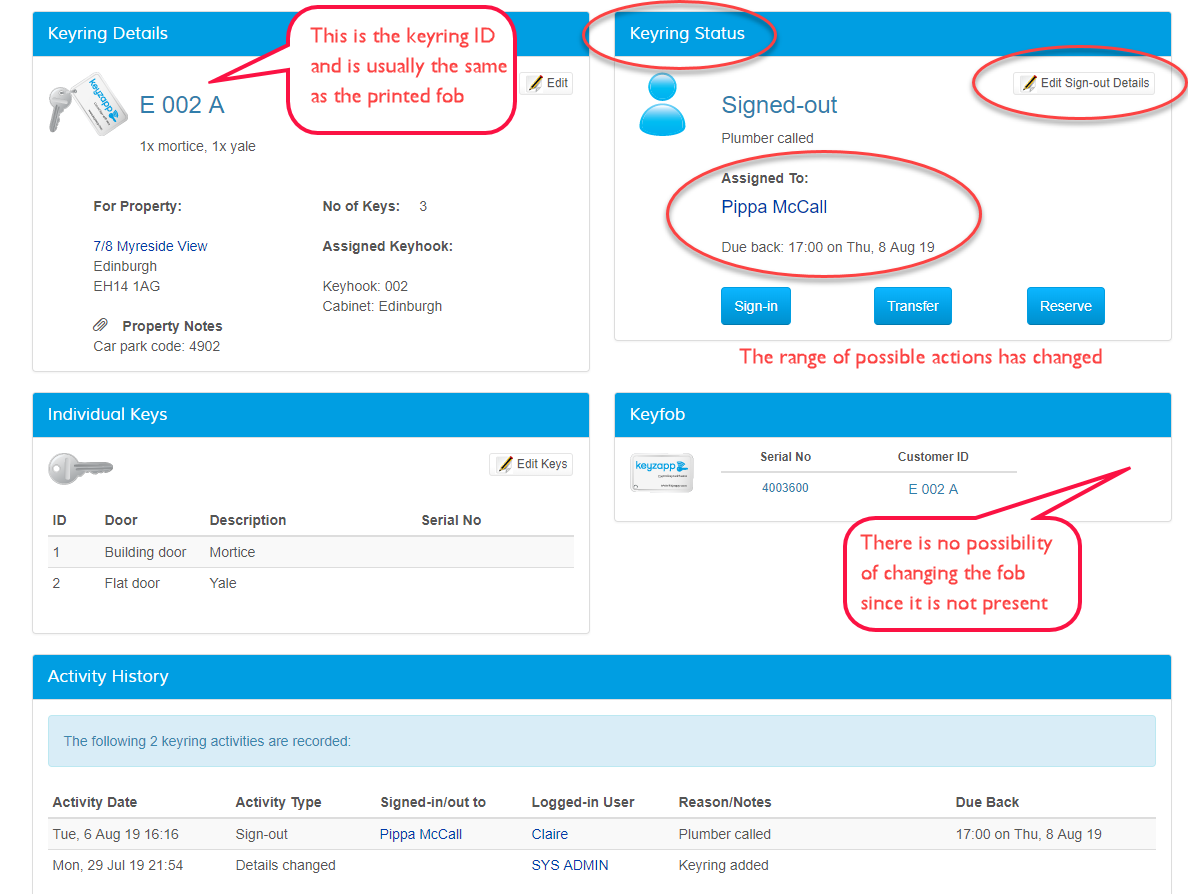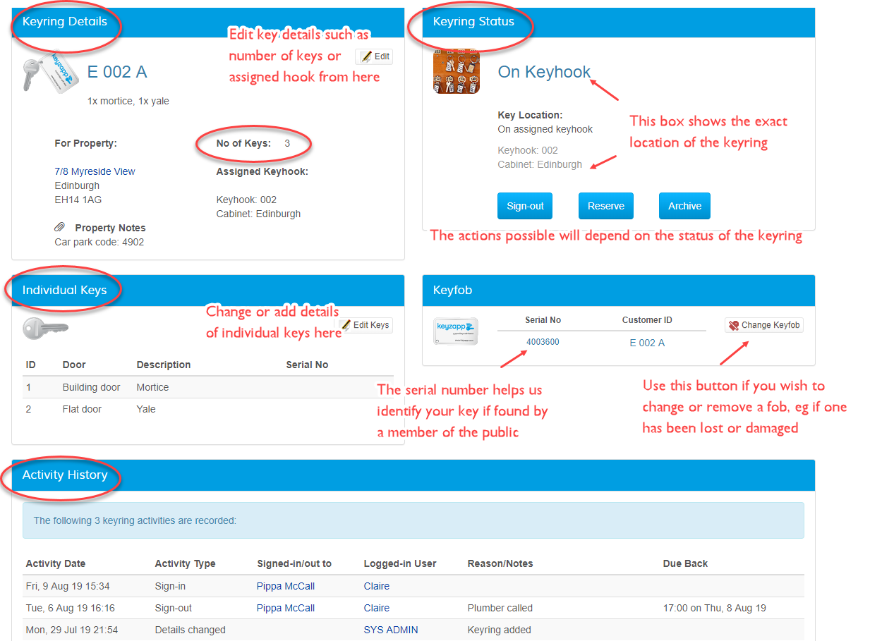 Each keyring in Keyzapp has its own page summarising the information available for it. Quick links from this page allow you to sign out, sign in, add details or track activity