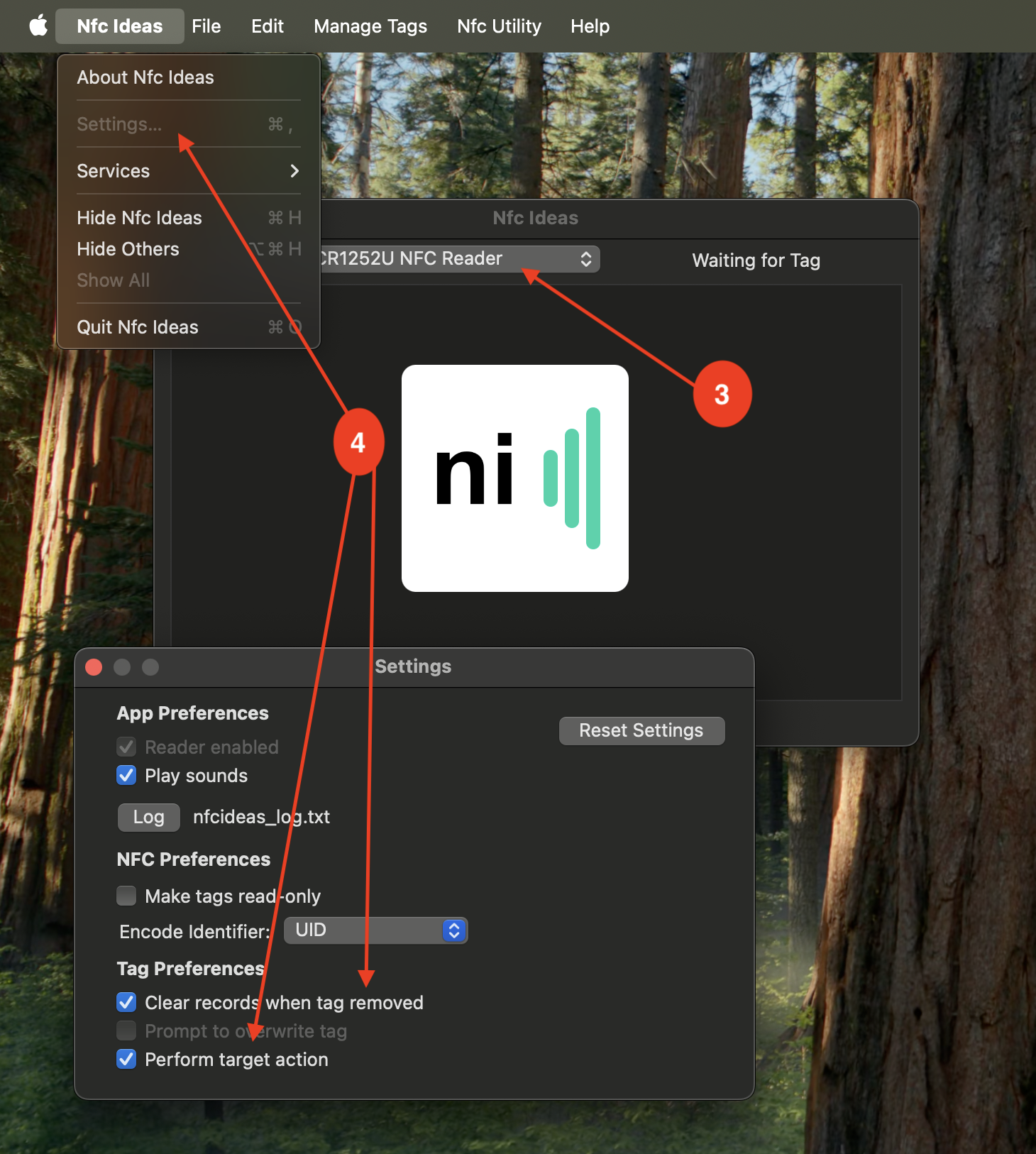 - Go to the NFC Ideas Menu and under Settings, make sure that under Tag Preferences, you click "Clear records when tag removed" and "Perform target action"